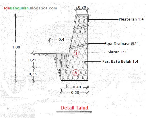 Nah, demikian contoh perhitungan volume talud dengan bentuk dan ukuran talud seperti apa yang ada di gambar. Talud diatas hanyalah sebuah contoh, dalam aplikasinya ada desain talud yang mungkin berbeda, demikian juga dengan ukurannya. Perlu di ingat, asumsi perhitungan diatas adalah untuk panjang talud 1 meter, hal ini untuk mempermudah dalam perhitungan. Bila panjangnya lebih berarti tinggal mengalikan panjang totalnya dengan volume per satu meter.